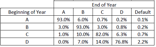 - an insurer without a long-term history of default ratios can use a transition matrix as in the example shown below