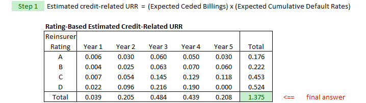 A variation on this problem could be to ask for the URR only for a specific year or a specific reinsurer rating. If so, make sure you provide this in your answer rather than giving only the total for all years and all reinsurers.