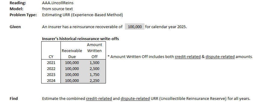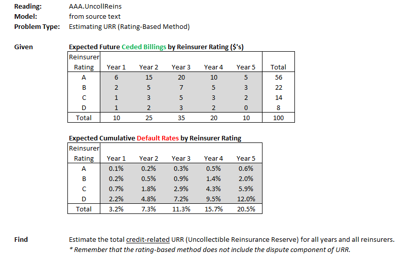 Something tells me this reading has a good chance of being tested because it's related to reinsurance, a heavily tested topic. The reading presents another method for estimating the "Uncollectible Reinsurance Reserve", or URR, and this is closely related to the calculation of the SAP Reinsurance Provision which is the most heavily tested topic from Chapter 14 of Odomirok.