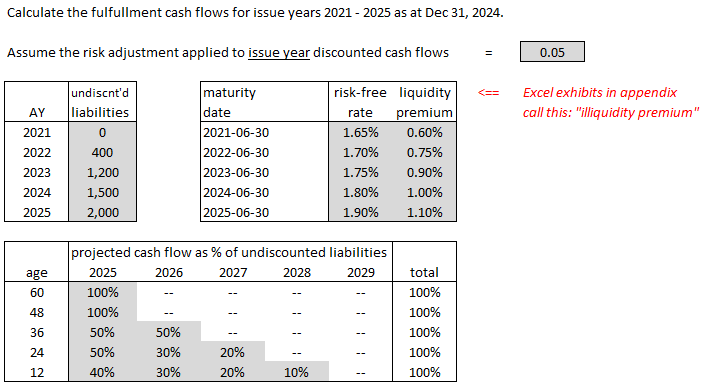 Below is a less simplified version of the example in the Excel appendix. It covers the important steps in selecting a discount rate all the way through to calculating the final FCFs (Fulfilment Cash Flows.) I think this would be a reasonable question to ask on the exam, especially now that the exam is given in Excel. None of the steps is hard but there are lots of little details you have to keep straight.
