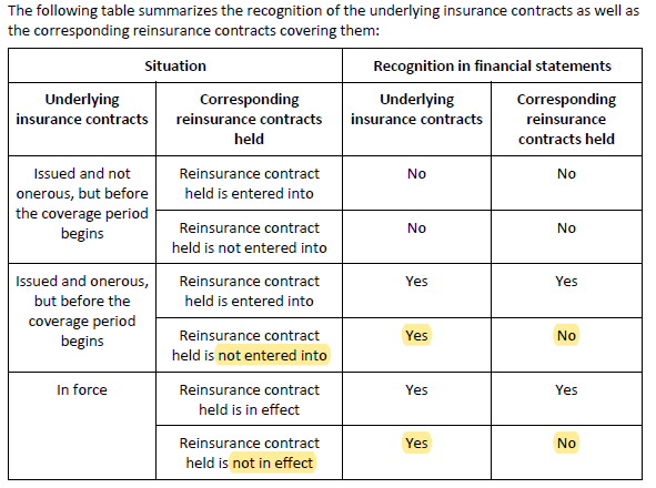 - Rows 3 and 4: If the underlying contract is onerous and has been issued, then both the underlying contract and the reinsurance contract must be recognized, even before coverage begins. (If no reinsurance contract has been entered into, then obviously it can't be recognized. That's the "no" answer in row 4.)