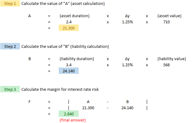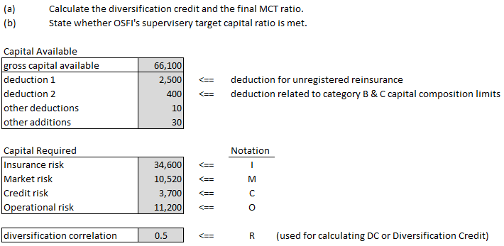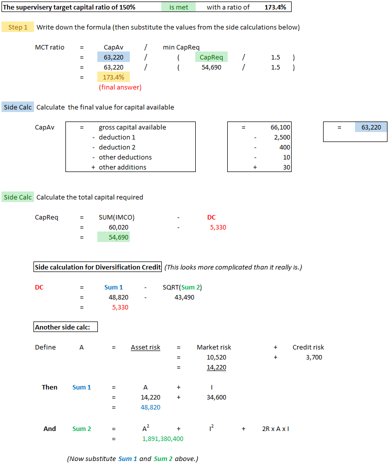 In this section, we'll cover a full example of calculating the MCT ratio. It's relatively easy because you're directly given the main components of the MCT formula - you just have to know what to do with them. Later on in this article, we'll look at more complicated examples where you have to calculate each component yourself from the raw financial statement data. When I say you're directly given the main components, here's an example of what I mean. If you glance down at the example, you'll see that total value for insurance risk is given as 34,600. Insurance risk however, has 4 separate components: