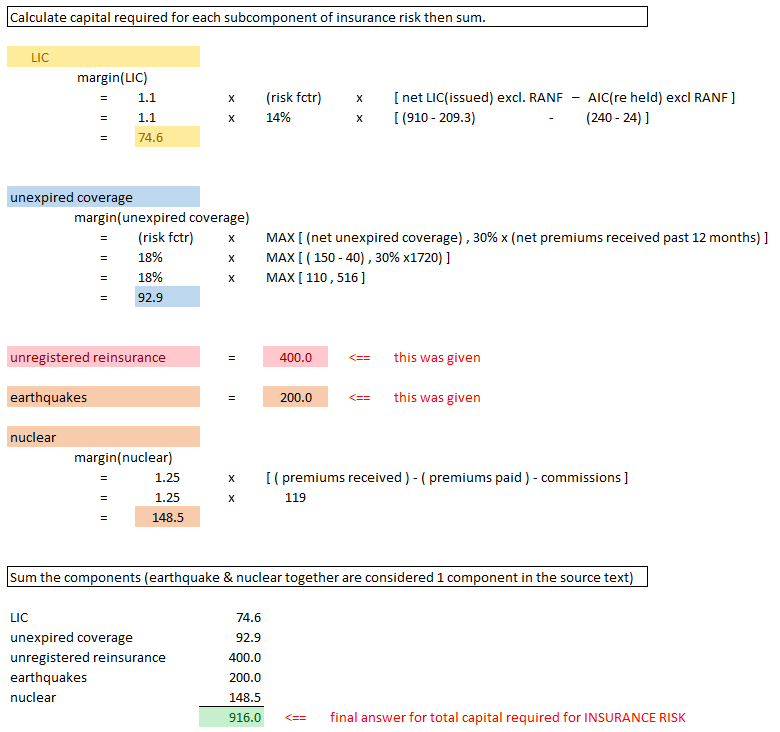 In practice, you would have to calculate these 4 components separately then sum to get the total value of insurance risk. The same general comment also holds for market risk, credit risk, and operational risk. Together, these risk charges comprise capital required (as shown the example) and the detailed calculations are covered in chapters 4-7. The detailed calculations for the components of capital available are covered in chapter 2. It might be an idea to take a quick glance at the chapter 8 on the diversification credit. Just click the link. It's very short.