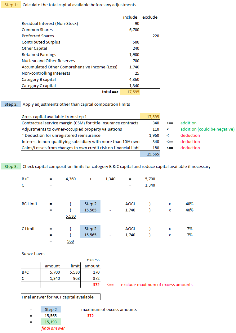 The MCT reading also details a procedure for calculating capital required. This is an estimated amount the insurer requires to support its particular risk profile, above and beyond normal reserves for unpaid claims. Obviously we want capital available to be greater than capital required. Otherwise, the insurer is at risk for insolvency.