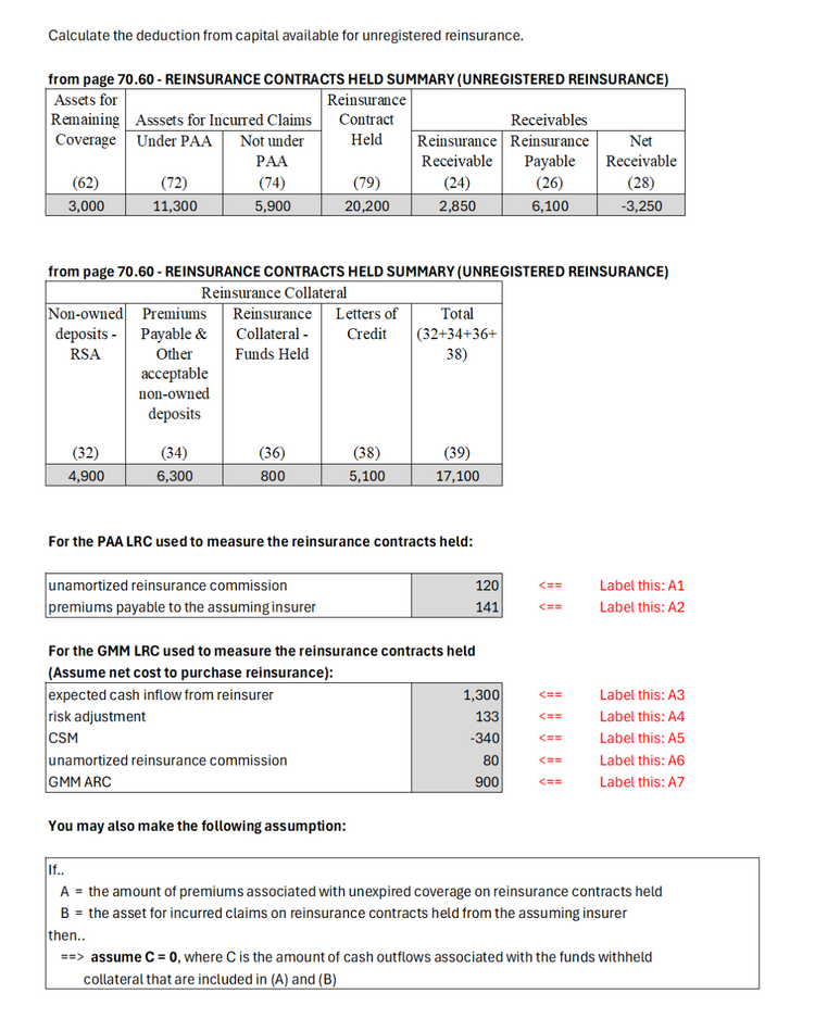 No past exam questions are available for the IFRS 17 version of this reading but there was one old exam problem (see below) that requires only 2 minor changes to be appropriate for IFRS 17. All you have to do is replaced "Net unpaid claims & adjustment expenses" with the equivalent IFRS 17 concept, LIC, and replace "Net premium liabilities" with LRC. Click link for a concise list of IFRS 17 terms and their definitions.
